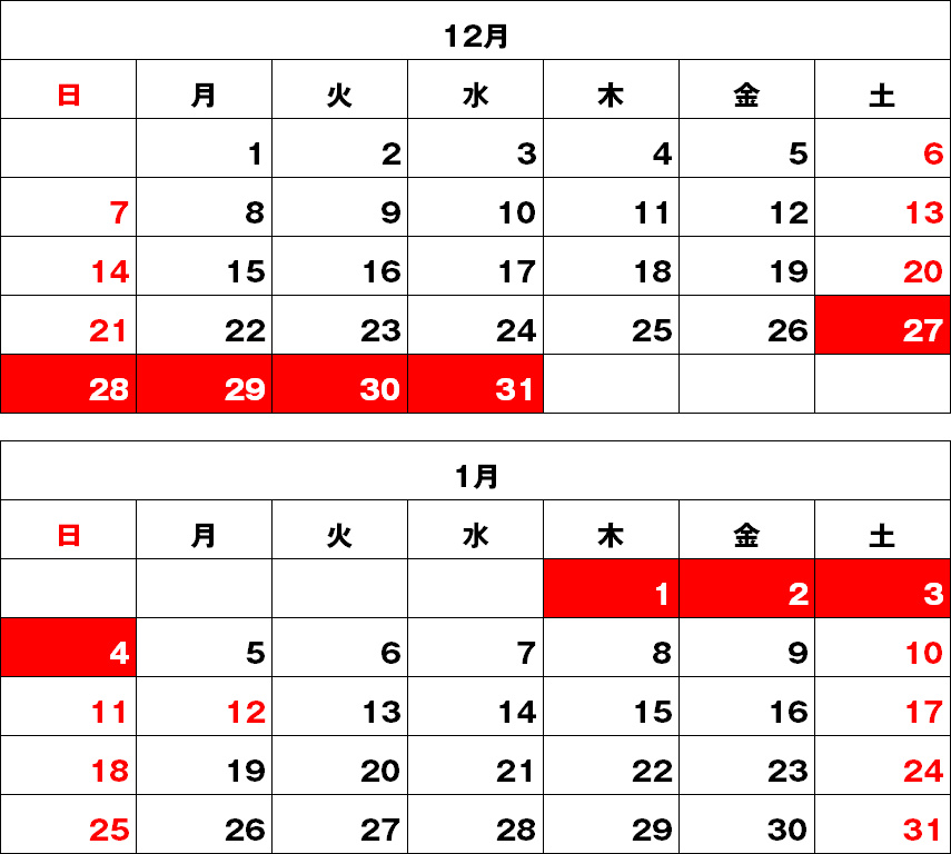 誠に勝手ながら12月27日(土)から1月4日(日)までの間、年末年始休暇とさせていただきます。